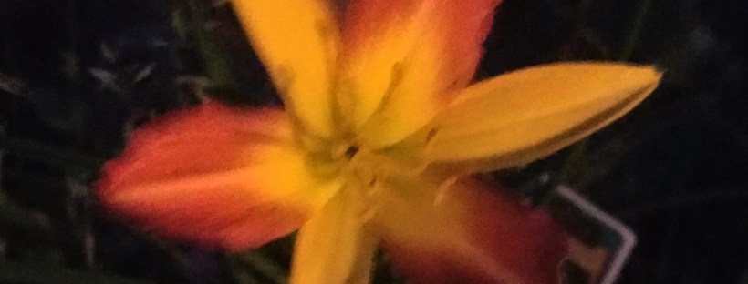 Daylilies bring to mind blooms that come and leave with the daylight,  each lasting only a day. Some, however, are called nocturnal or extended bloom. These open in the evening and bloom all night, perhaps until the following evening. This is Yellow Punch with a retro filter.