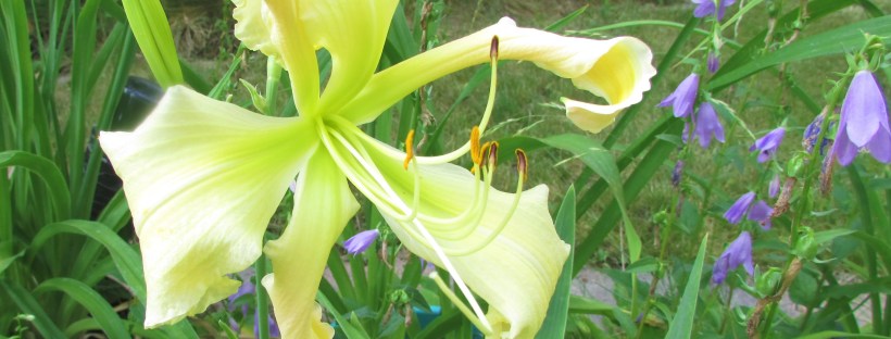 Today was a celestial day in the garden. Heavenly Curls bloomed for the first time since 2016. I added her as a bonus plant in 2015. She did not bloom in 2017. She is clearly happier in the buried pot – very nice bloom this year. She has the most awesome shape of any of my curly daylilies! And, more than a couple buds (so far). Still no rain, so I am seeing a few buds dry up around the garden despite my endless watering.