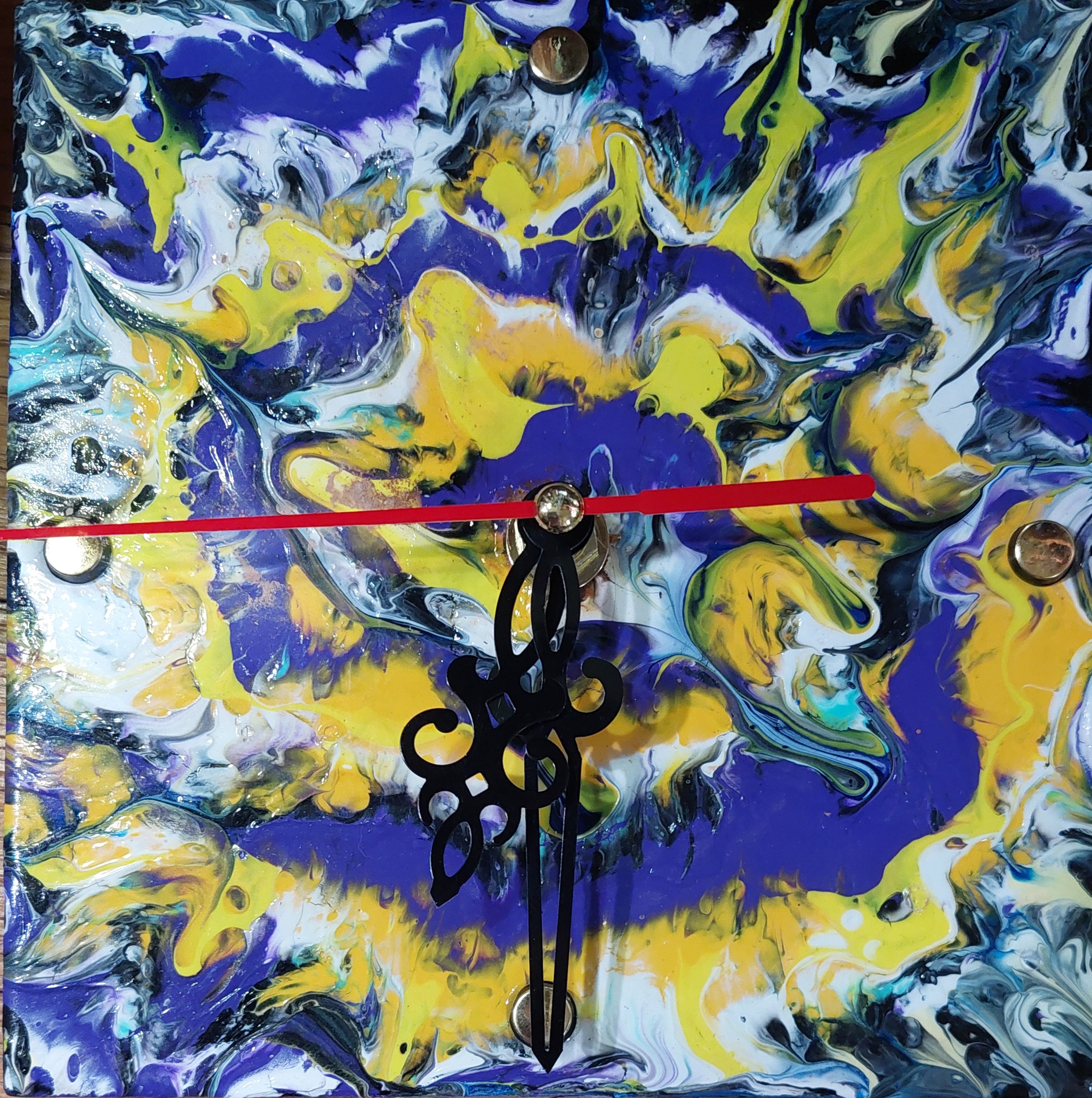 All of my hand painted tile clocks. There are stunning pour paint on tile and wood styles (various sizes) and landscape clocks. I even have one daylily clock.