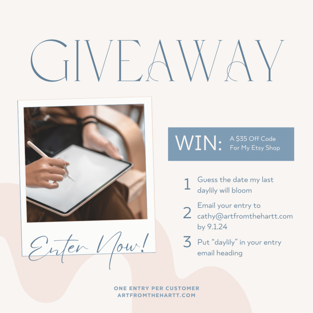 I also have the give-away of $35 if you email a guess on the day the last daylily will bloom. Entries are due by midnight September 2nd. Email me at cathy@artfromthehartt.com with your guess (the day my last daylily blooms for 2024) and put daylily in the topic to enter. More info on the contest here – click.