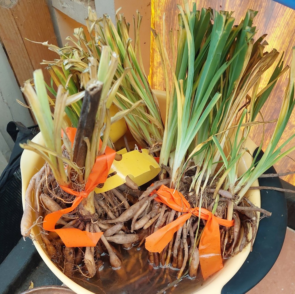Daylily roots taking a re-hydration swim before being planted in my yard today.