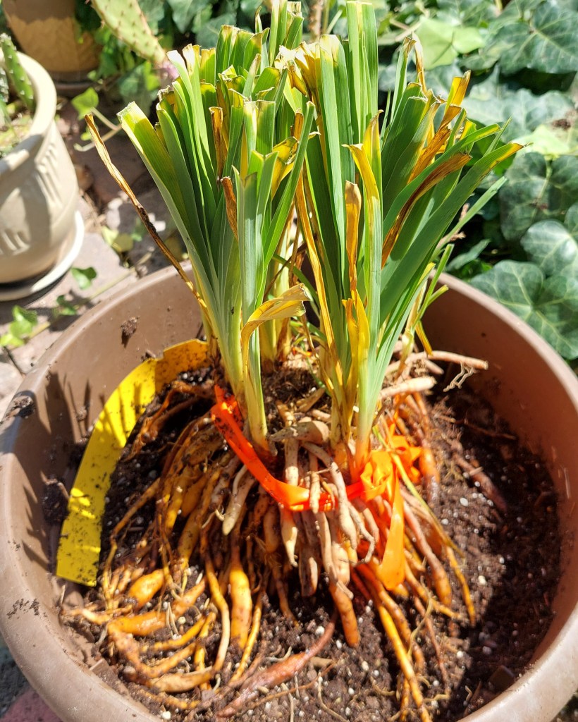I generally soak my roots in a big pot to rehydrate them for a day or two before planting. This year, I decided to convert my two squash pots to daylilies because the squash have not done well. You can see how I place the roots in the pot. I cover them and trim the plant back. It’s magic to watch the leaves put out new growth before freeze.