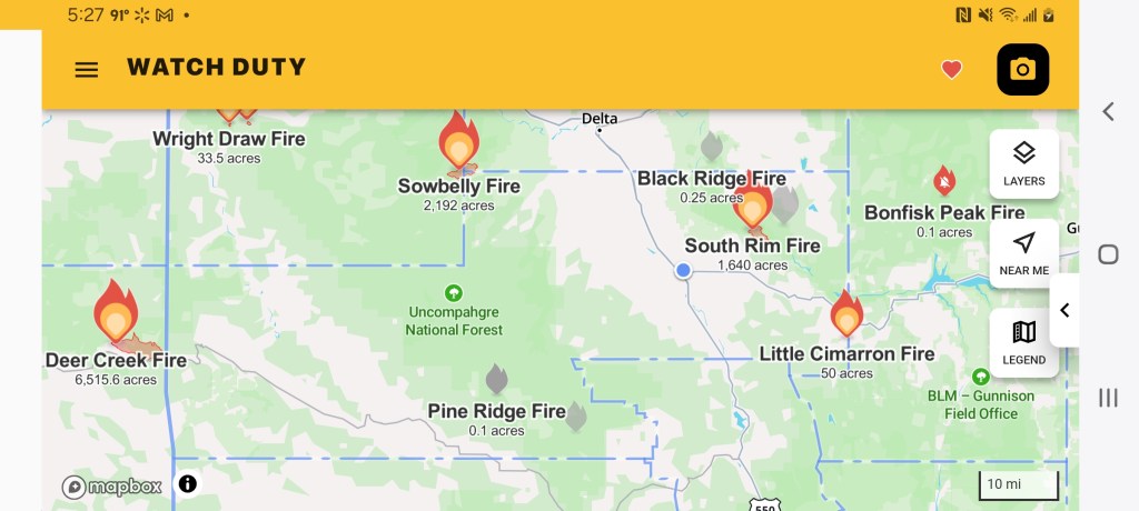 Now, the Black Canyon of the Gunnison is evacuated because of an active fire on the South Rim – about 15 miles away on the road – maybe 10 miles as the crow flies. The smoke and air quality are bad. The South Rim Fire is one of three very active fires in my county – the others are the Sow Belly Fire and the Deer Creek Fire. I can hear the aircraft humming almost constantly from my garden, about 2 miles from our airport.