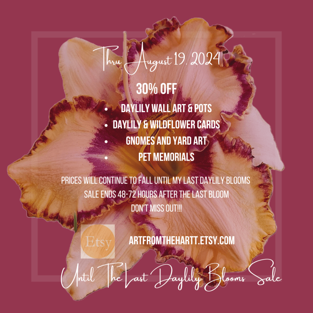 On the 20th of August, my Until the Last Daylily Blooms sale prices drop to 35% off select items in my Etsy Shop. These prices drop to 40% off is I still have a daylily in bloom on September 20th. My sale ends within 72 hours of my last daylily bloom! Don’t wait!