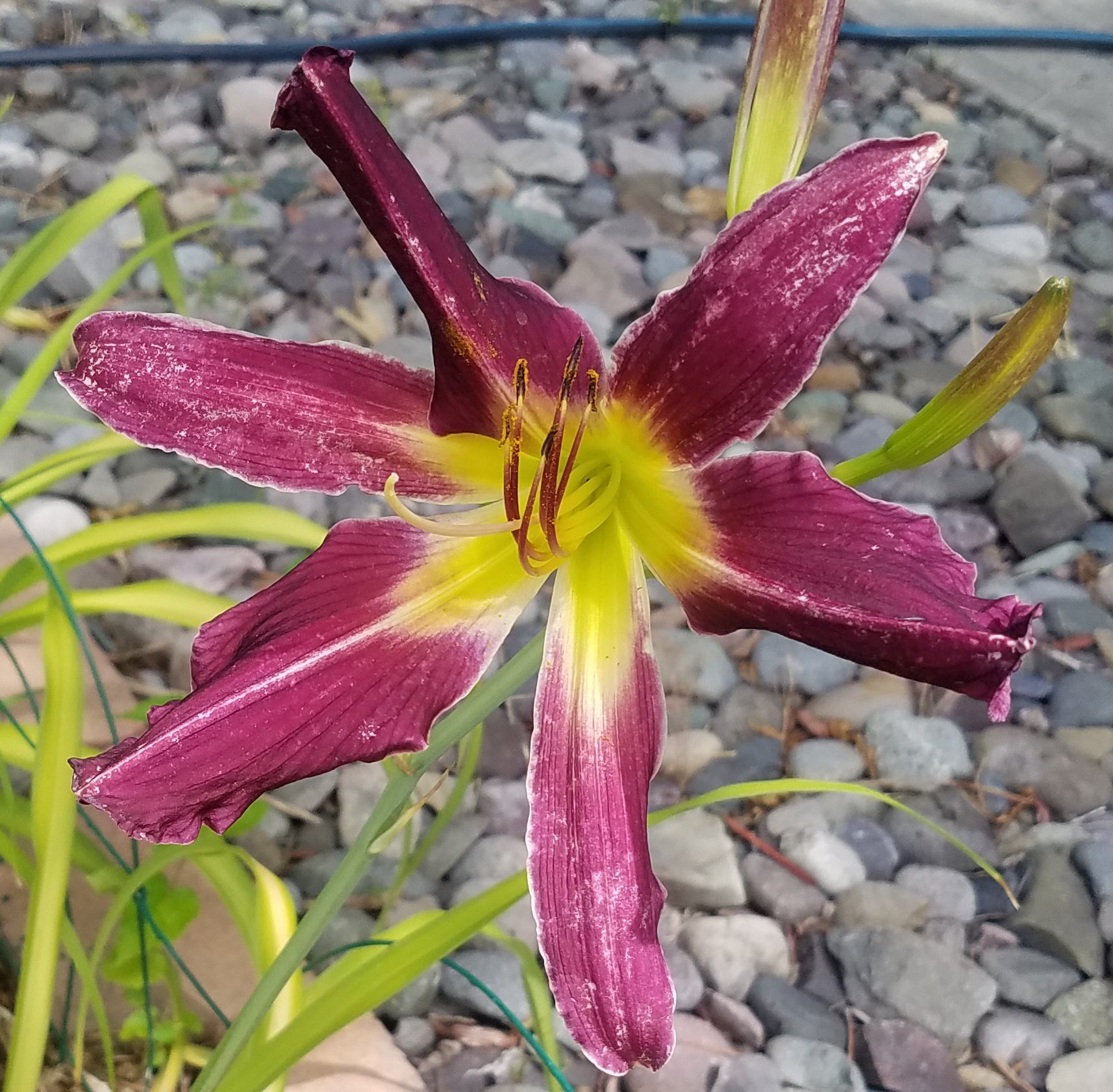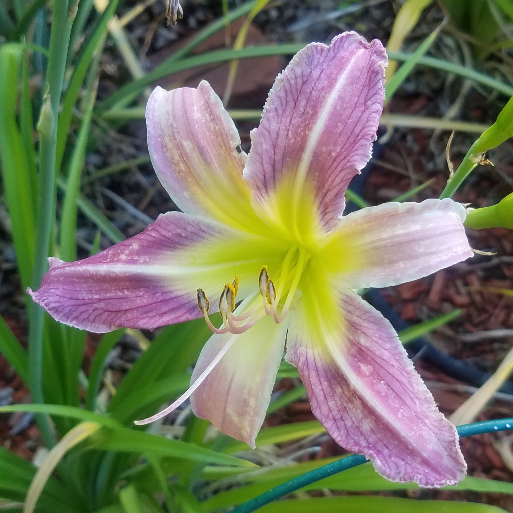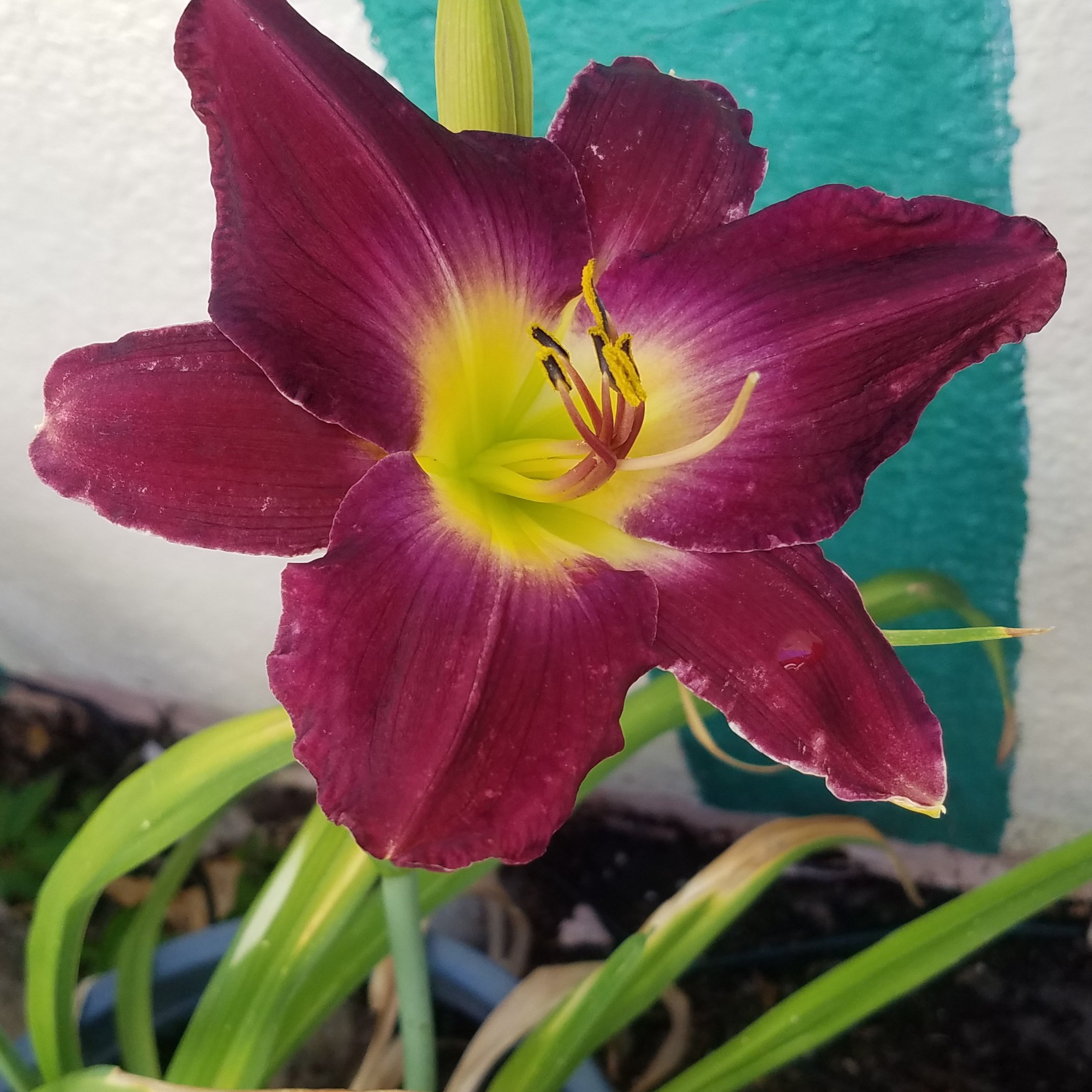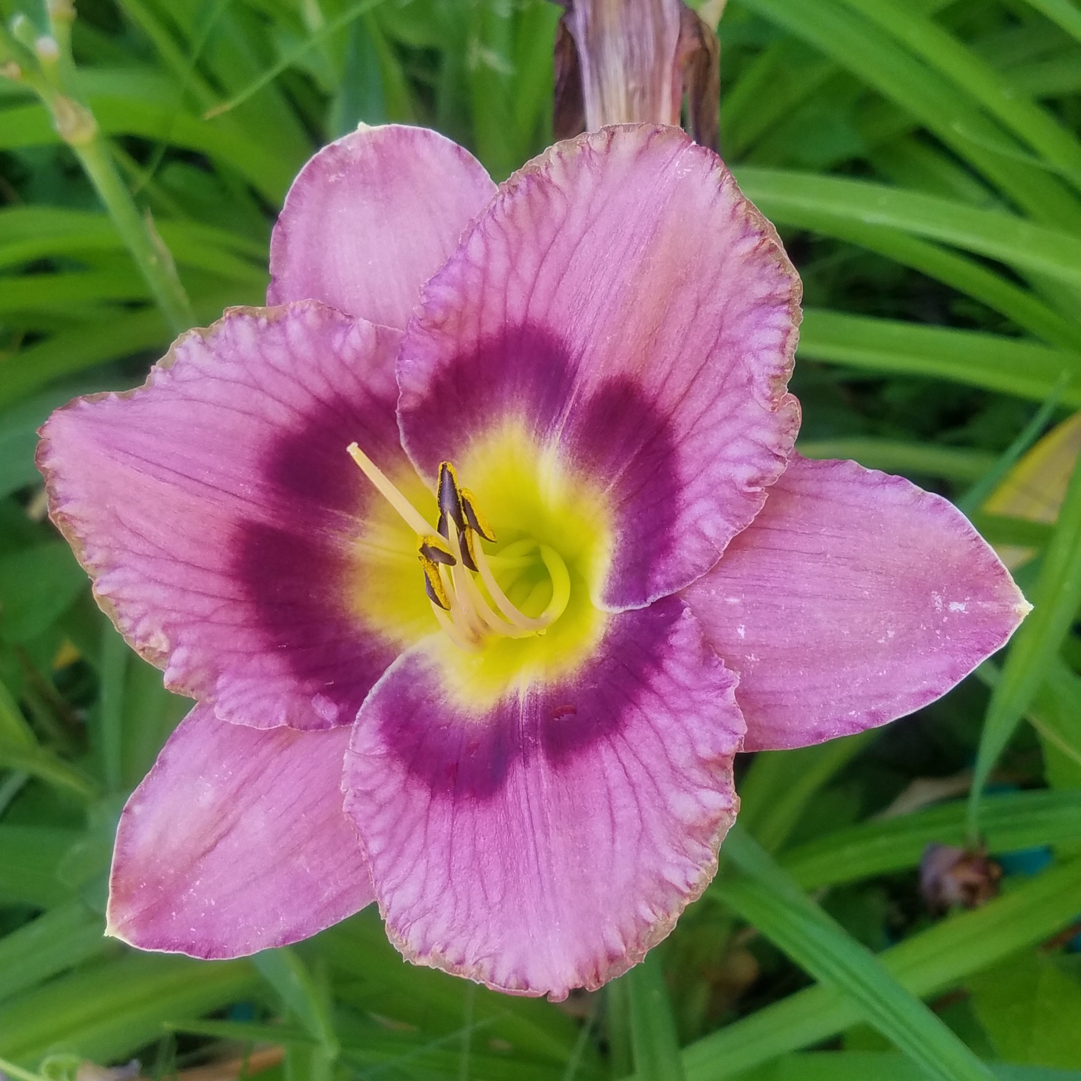 Why is it that we always want what we can’t have? Early in my daylily addiction, when I had planted my first mail-order roots, I became fascinated with blue daylilies. Well, actually, daylilies lack the genetics to make blue. So, you know, I became infatuated with “near blue” daylilies whose mosiac genetics lead them to look blue. This predates my addiction to Ned Roberts spiders. All my near blues are in pots and come into the back porch for the winter because they are evergreen daylilies and prefer warmer temps. My near blues have a special spot in the front yard where the pots live from March-October.