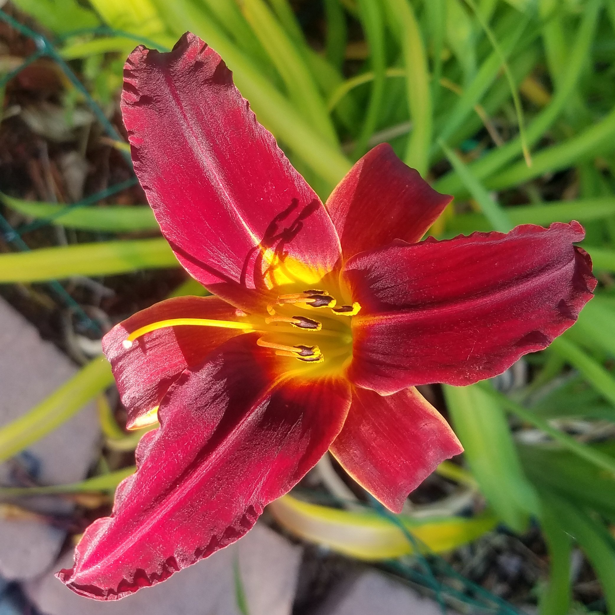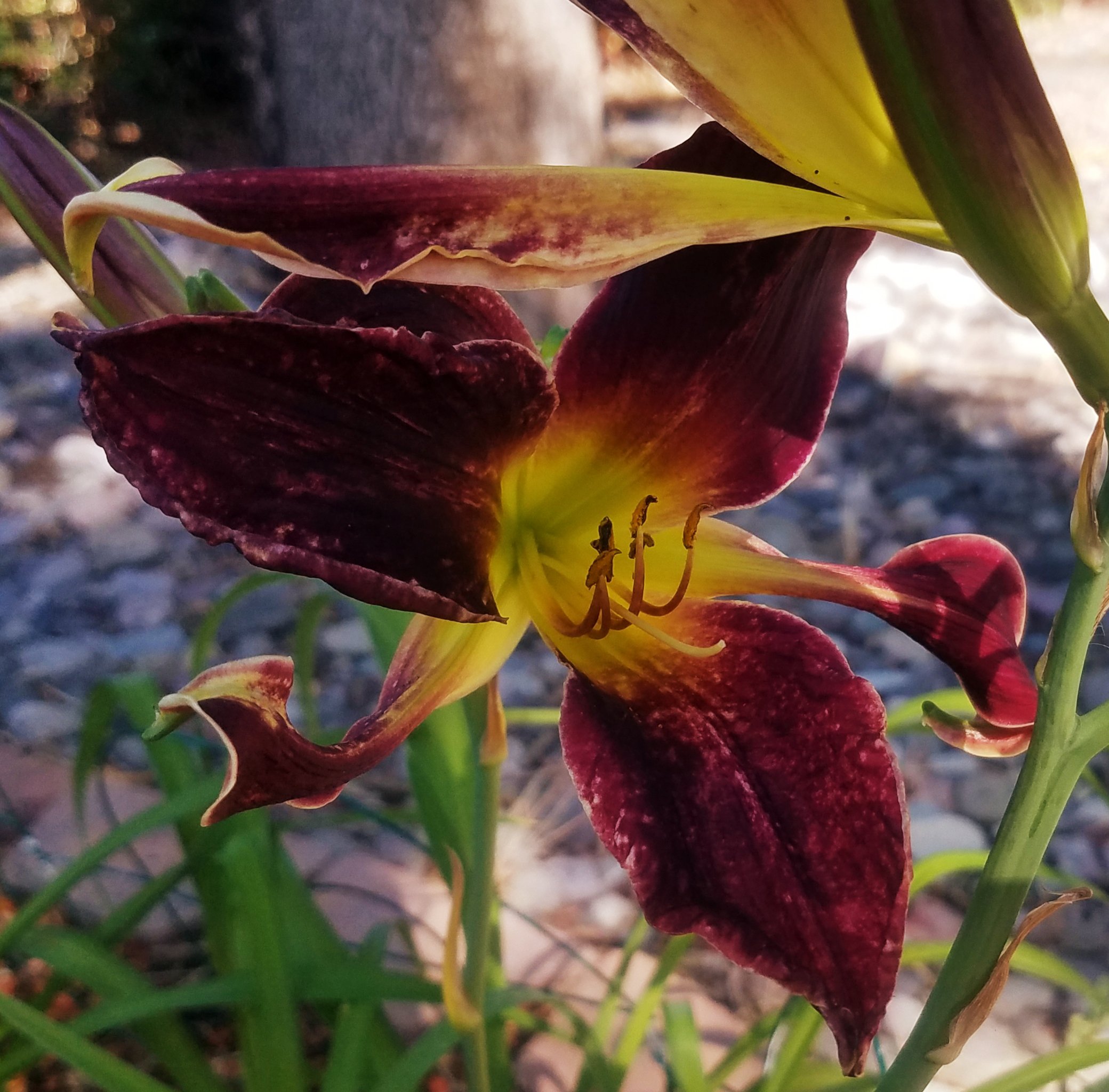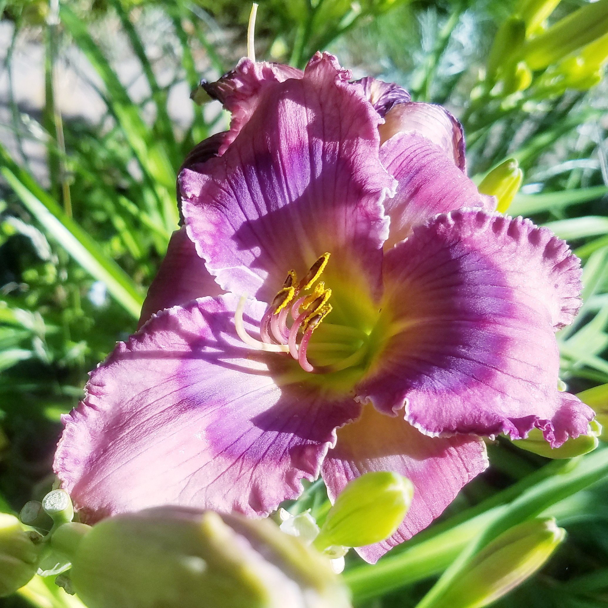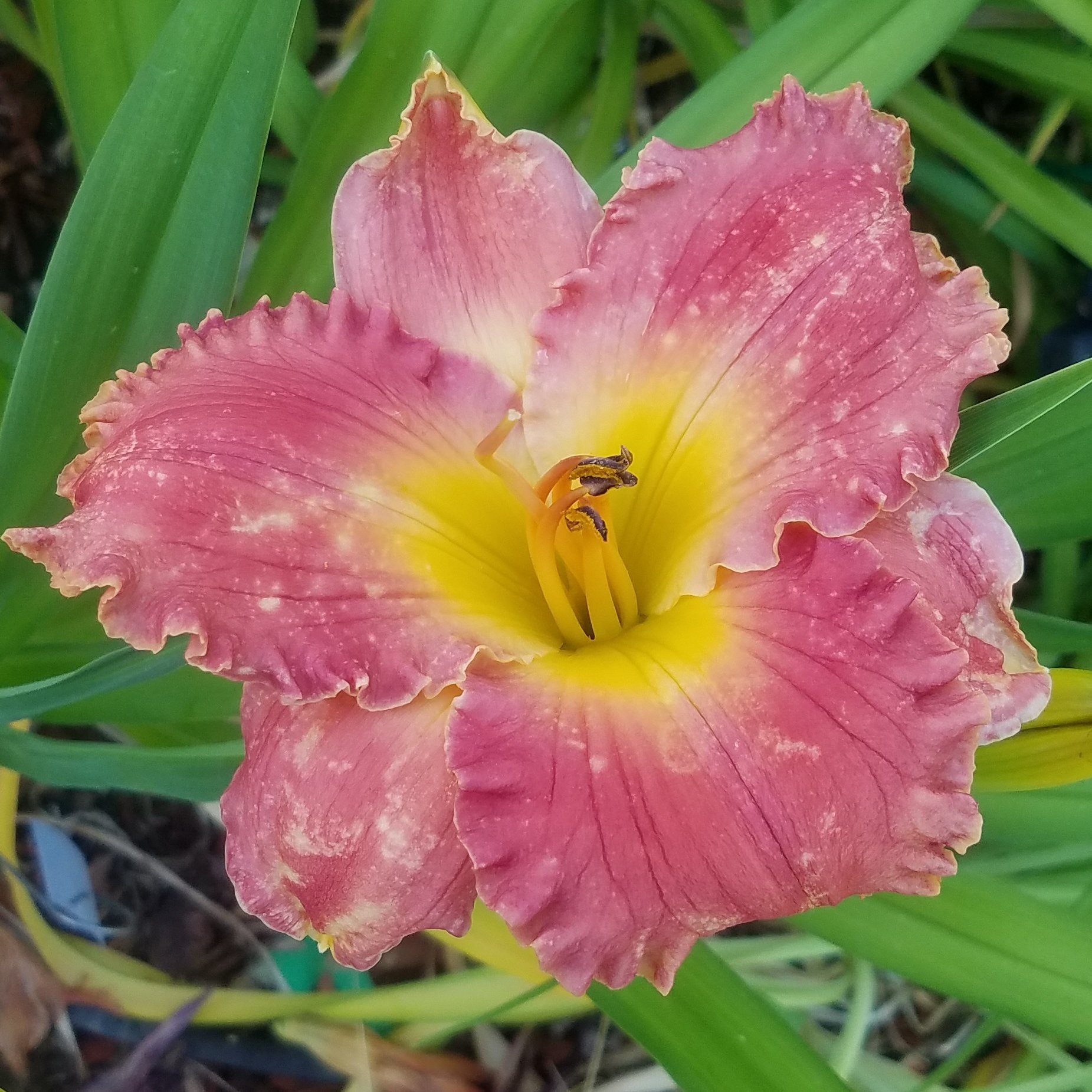 Why is it that we always want what we can’t have? Early in my daylily addiction, when I had planted my first mail-order roots, I became fascinated with blue daylilies. Well, actually, daylilies lack the genetics to make blue. So, you know, I became infatuated with “near blue” daylilies whose mosiac genetics lead them to look blue. This predates my addiction to Ned Roberts spiders. All my near blues are in pots and come into the back porch for the winter because they are evergreen daylilies and prefer warmer temps. My near blues have a special spot in the front yard where the pots live from March-October.