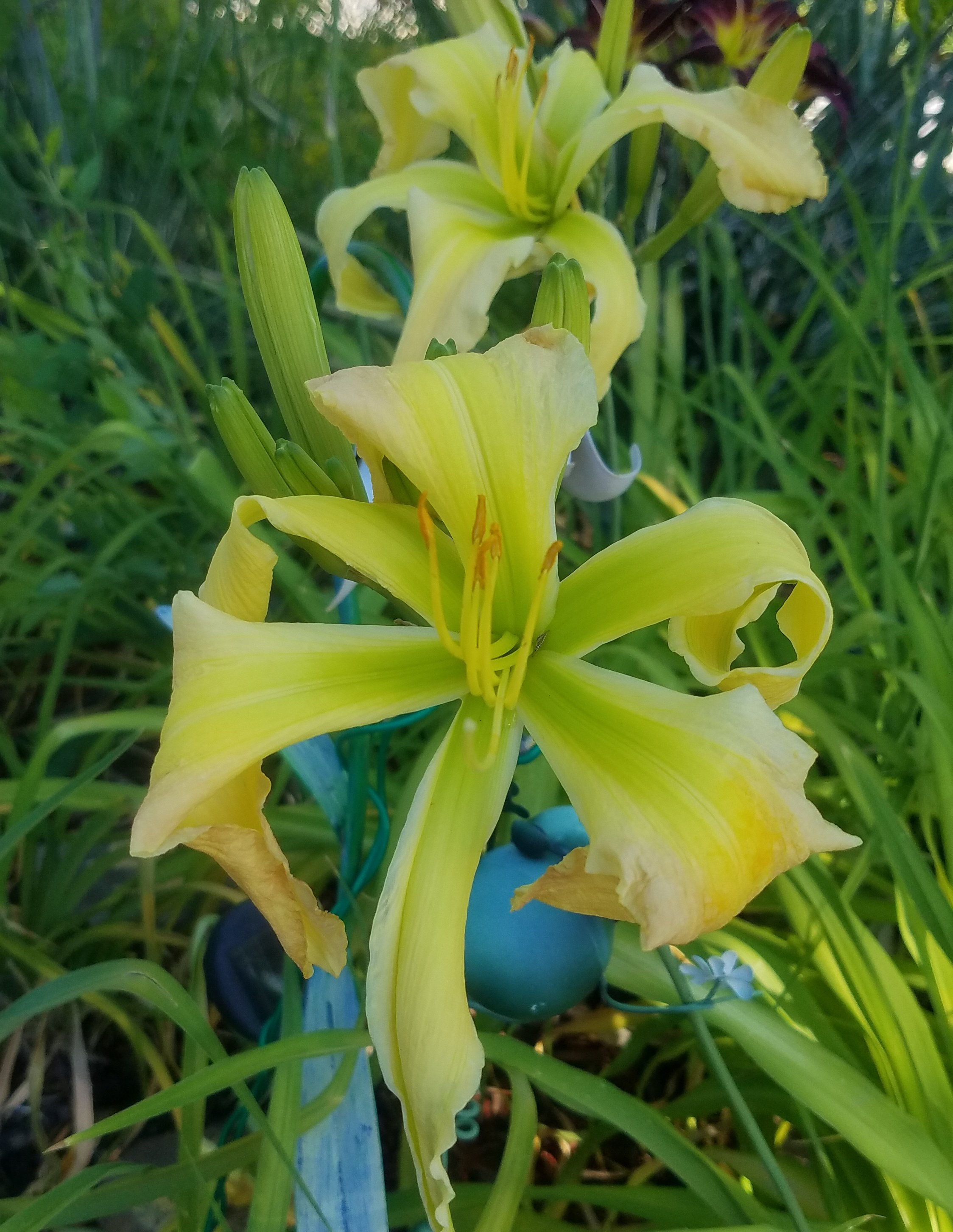 I am going to show off my other near blues because their bloom cycle is nearing an end. My favorite is The Colorado Kid. I was just googling place names to see if there were daylilies with that name – and she popped up. I think this is year 4 for her – she is our mascot flower. She had a lot of blooms this year and has a couple of buds left. Baby Blue Eyes has similar coloring.