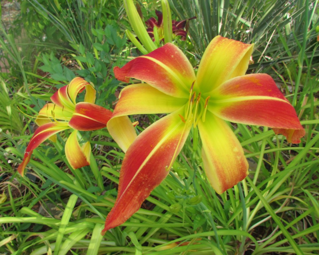 The other one from today is Inwood, who is having a better than average year. Her buds are healthy and she has more spikes than average. I was delighted to see such a pretty bloom. She reminds me a bit of Canyon Colors, who is having a bad year and I think it is because the grass is taking over her pot. As soon as her sad scape gets done blooming, I will dumb her our and dig the grass off of her roots.