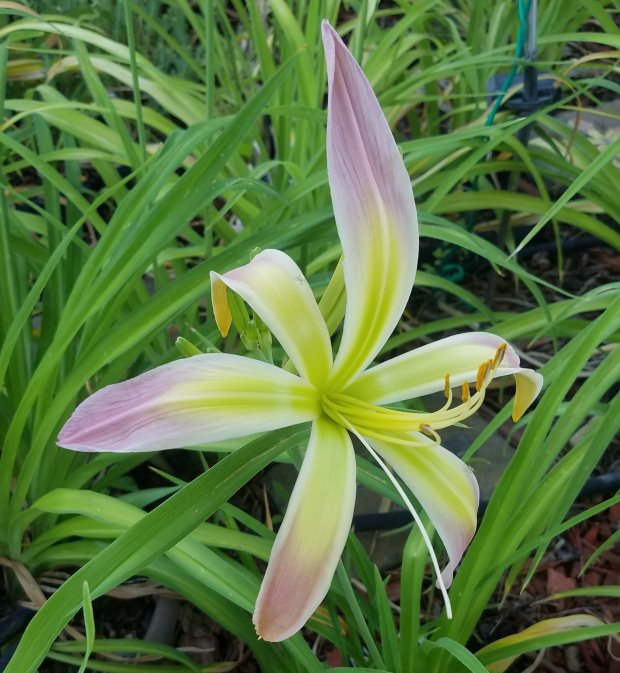 Only 40 something daylilies today and no Premiers.  So, it leaves time to talk about some of my daylily categories.  I have talked a lot about my Ned Roberts spiders.  I originally started collecting them after seeing Kokopelli on the Lily Auction – I love the Southwest and had to have her (I got the bid)!  From there, I added more = lots more.  At first, it was all fully Southwest names.  Then, I gathered some animal and insect names to my Ned collection.  And, some stellar names.  IDK, is Dancing Maiden a name from the Southwest?