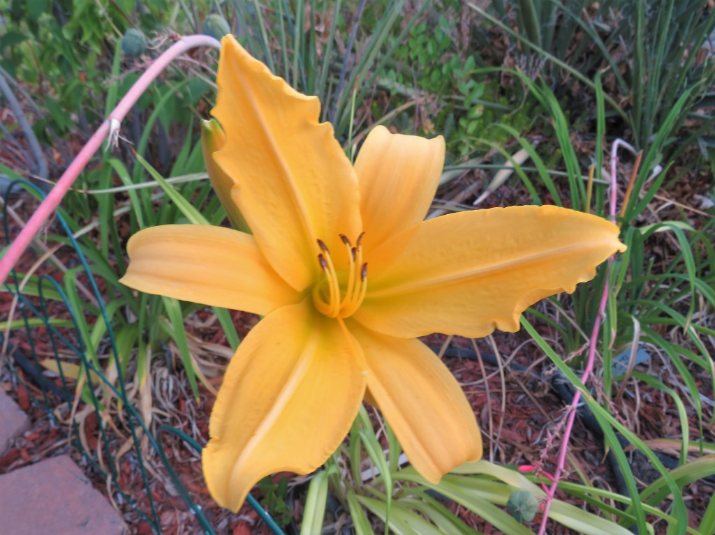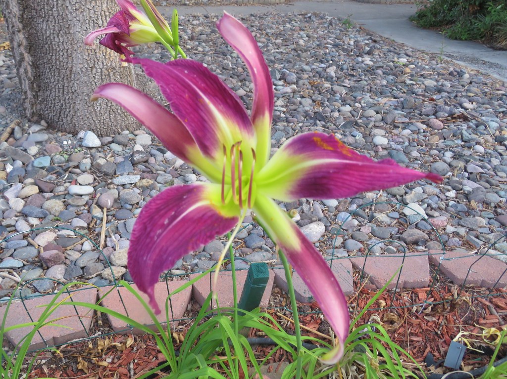 Droughts and wildfires go together, daylilies not so much. The smoke has cleared (mostly) from the Black Canyon of the Gunnison South Rim Fire (<10 miles away), and they have the fire 15% contained. My last blog post talks more about the fire. Some rain has fallen on my garden since the last post, too. The drought continues, though. Keep reading to enjoy my daylilies from the past week!