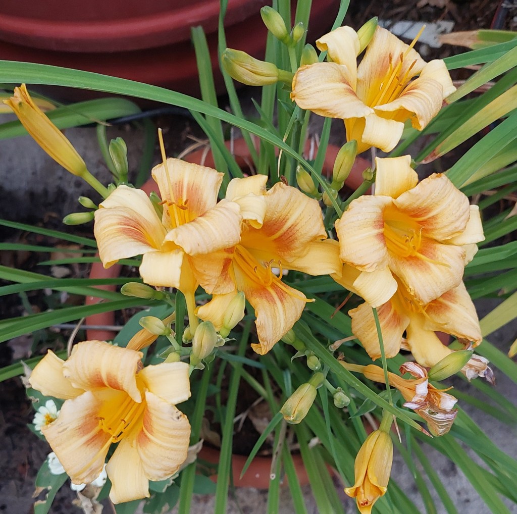 I have had a total of 139 cultivators bloom this season (out of around 190). That is a 73% bloom rate. Last year, we only got to the mid-sixties, so I am thrilled. And, the season isn’t over. In the high desert, 80% is a huge win. I need to fertilize, but without the monsoon moisture and cooler temps, I am waiting until next month. With daylilies in pots, I find applying liquid fertilizer improves bloom rate for the following year because the plant is more resilient.