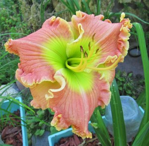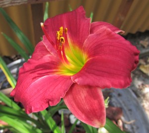 Then – one of my mystery daylilies that were dying in a garden I put them in before I was into daylilies. They were little seedling sized things. I noticed that about the same time I realized my potted daylilies were 2-3 X the size as my in-ground babies. So, I put them in a pot together not having a clue what was what. I think this may be Nosferatu but I really don’t know, so she is called Nosferatwo for now.